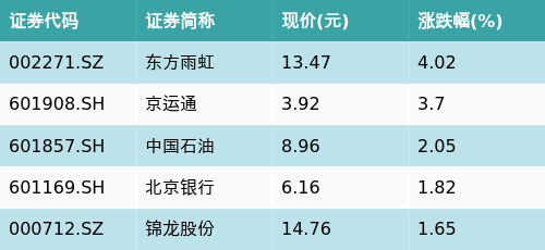 截至午间收盘,参股保险主题涨跌幅最高的五只股票为:东方雨虹(002271.SZ)、京运通(601908.SH)、中国石油(601857.SH)、北京银行(601169.SH)与锦龙股份(000712.SZ)。详情见下表: