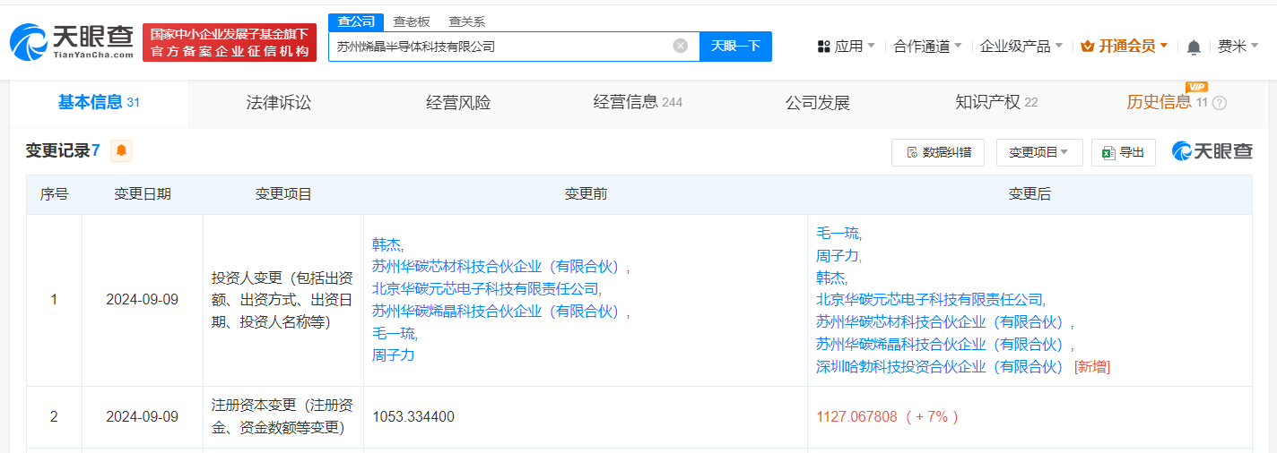 南方财经9月13日电,天眼查App显示,近日,苏州烯晶半导体科技有限公司发生工商变更,新增华为旗下深圳哈勃科技投资合伙企业(有限合伙)为股东,公司注册资本由约1053.33万人民币增至约1127.07万人民币,同时新增多位董事和监事。该公司成立于2022年4月,法定代表人为韩杰,经营范围含半导体分立器件制造、半导体分立器件销售、电子专用材料研发、电子专用材料制造、电子专用材料销售、货物进出口等,现由韩杰、北京华碳元芯电子科技有限责任公司、苏州华碳芯材科技合伙企业(有限合伙)等共同持股。