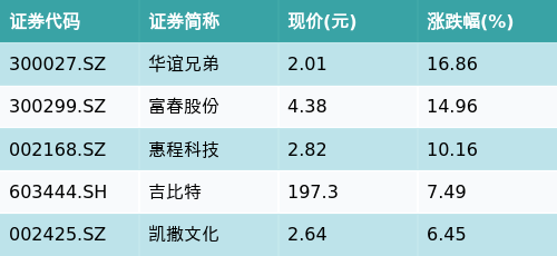 截至午间收盘,网络游戏主题涨跌幅最高的五只股票为:华谊兄弟(300027.SZ)、富春股份(300299.SZ)、惠程科技(002168.SZ)、吉比特(603444.SH)与凯撒文化(002425.SZ)。详情见下表: