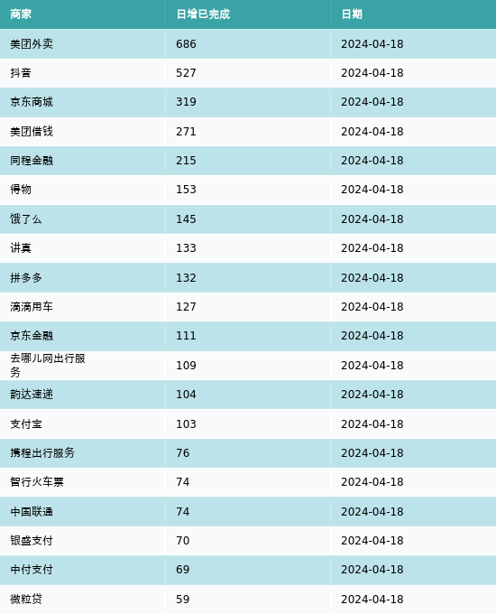 南方财经4月19日电,根据黑猫投诉网站数据显示,4月18日新增投诉完成处理最高前三名的商家分别为:美团外卖、抖音和京东商城,分别增加686起、527起和319起。4月18日新增投诉完成处理前20详情见下表: