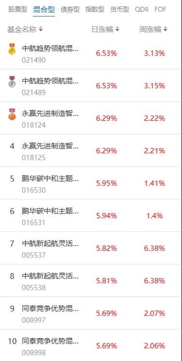 南方财经6月25日电,根据南财基金通数据:2025年06月24日当日收益靠前的混合型基金包括:中航趋势领航混合型发起式证券投资基金(021490,日收益6.53%);永赢先进制造智选混合型发起式证券投资基金(018124,日收益6.29%);鹏华碳中和主题混合型证券投资基金(016530,日收益5.95%)等。收益较低的混合型基金包括:银华内需精选混合型证券投资基金(LOF)(161810,日收益-1.98%);华富永鑫灵活配置混合型证券投资基金(001466,日收益-1.92%);长城景气成长混合型证券投资基金(018940,日收益-1.44%)等。