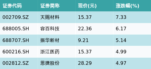 截至收盘,钠离子电池主题涨跌幅最高的五只股票为:天赐材料(002709.SZ)、容百科技(688005.SH)、振华新材(688707.SH)、浙江医药(600216.SH)与恩捷股份(002812.SZ)。详情见下表: