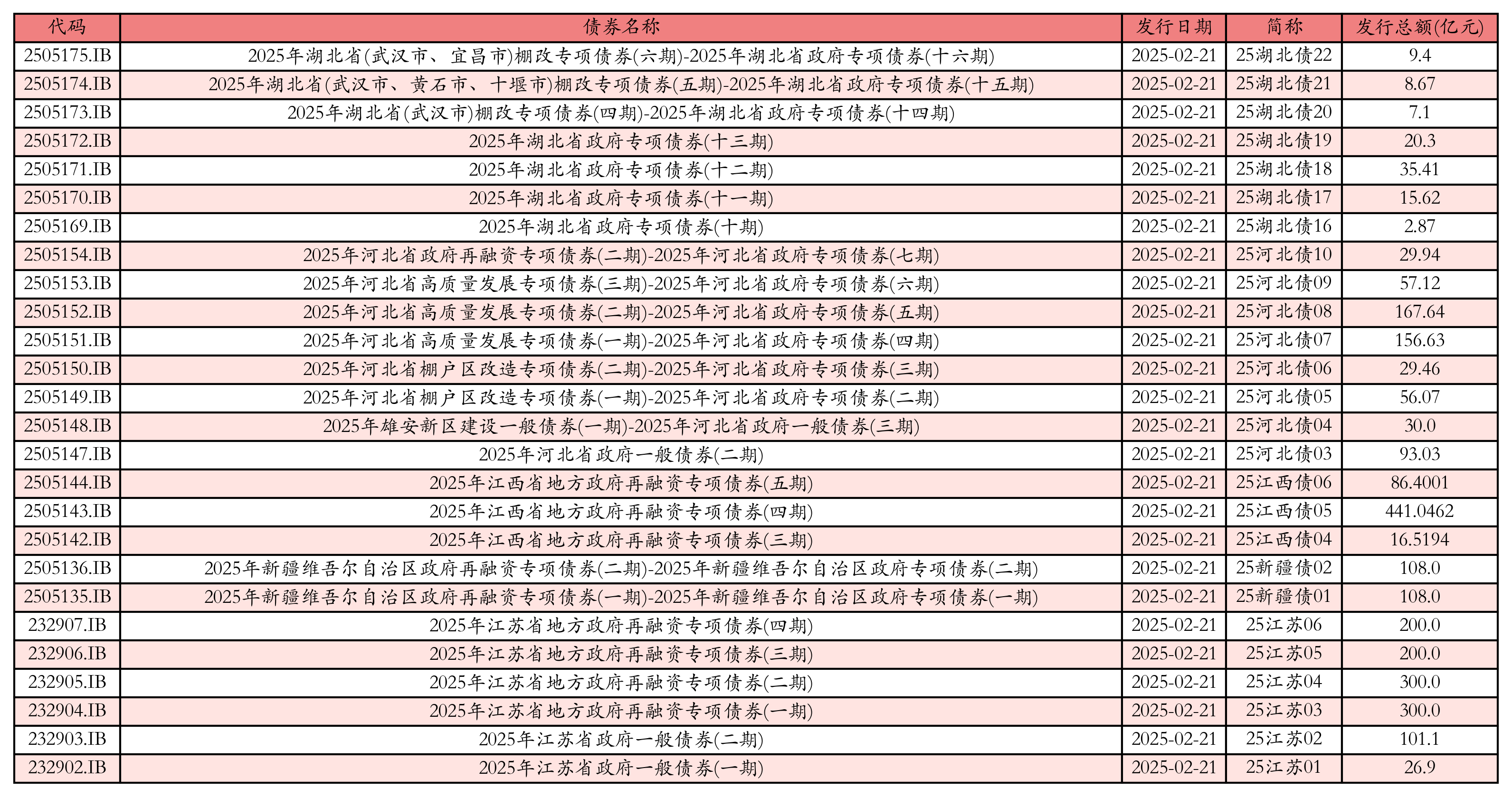 各地方政府所发行债券中,25新疆债02、25江苏04、25江西债05、25河北债08、25湖北债18发行规模靠前,发行金额分别为108.0亿元、300.0亿元、441.0462亿元、167.64亿元、35.41亿元。