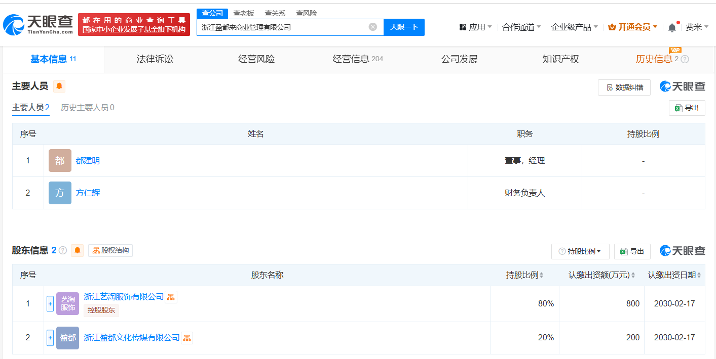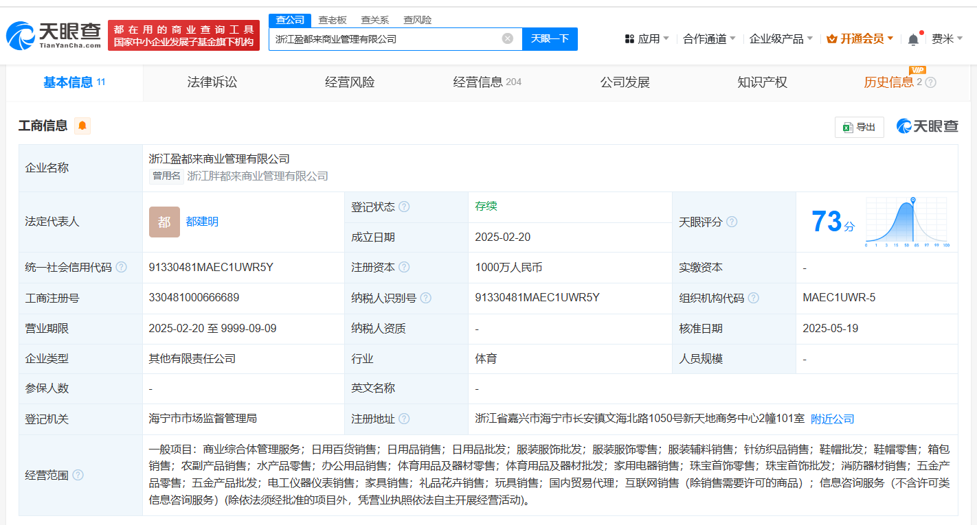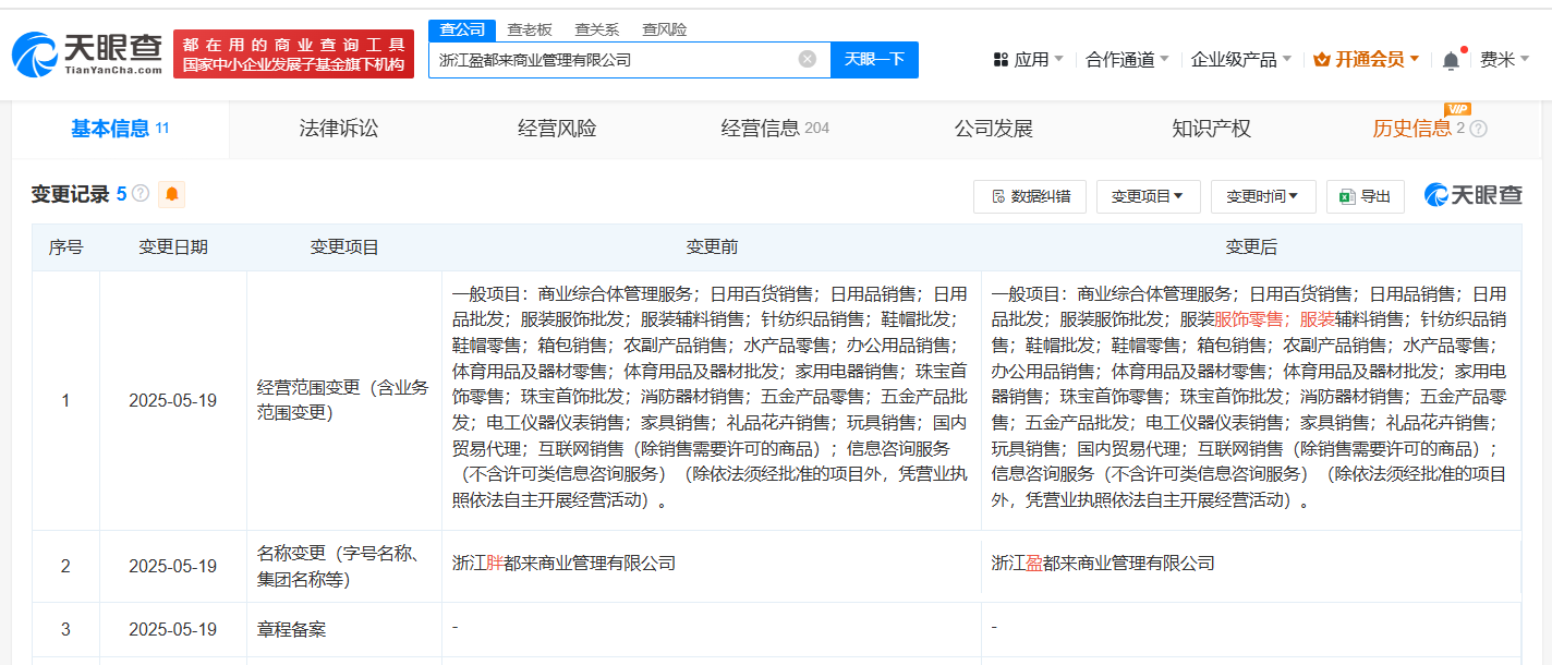 南方财经5月23日电,天眼查App显示,近日,浙江胖都来商业管理有限公司发生工商变更,企业名称变更为浙江盈都来商业管理有限公司,经营范围新增服装服饰零售。该公司成立于今年2月,法定代表人为都建明,注册资本1000万人民币,经营范围包括商业综合体管理服务、日用百货销售、珠宝首饰零售等,由浙江艺淘服饰有限公司、浙江盈都文化传媒有限公司共同持股。据媒体报道,近期,多位网友发布视频称,发现胖都来商场已将名字改为“盈都来”。