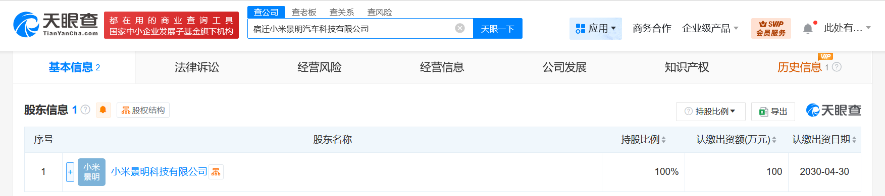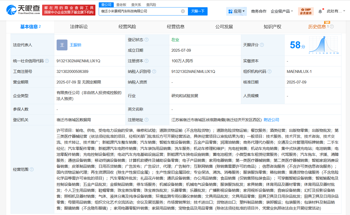 南方财经7月10日电,天眼查App显示,近日,宿迁小米景明汽车科技有限公司成立,法定代表人为王振锁,注册资本100万人民币,经营范围含输电、供电、受电电力设施的安装、维修和试验,道路货物运输,道路危险货物运输,餐饮服务,酒类经营,新能源汽车整车销售,汽车销售,二手车经纪等。股东信息显示,该公司由小米景明科技有限公司全资持股。
