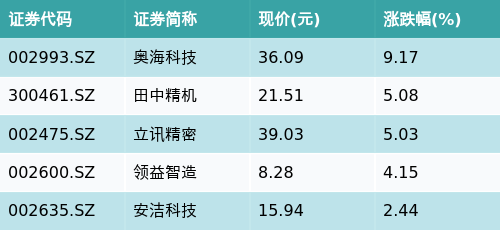 截至午间收盘,无线充电主题涨跌幅最高的五只股票为:奥海科技(002993.SZ)、田中精机(300461.SZ)、立讯精密(002475.SZ)、领益智造(002600.SZ)与安洁科技(002635.SZ)。详情见下表: