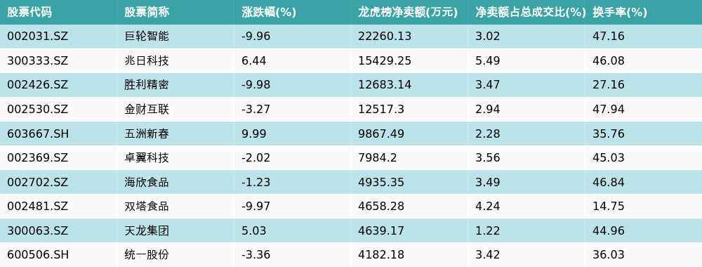 南方财经12月13日电,南财金融终端数据显示,因当日异动登上龙虎榜的个股中,龙虎榜中资金净流出最多的前三位分别是巨轮智能(002031.SZ)、兆日科技(300333.SZ)与胜利精密(002426.SZ)。其中排名第一的巨轮智能被净卖出2.23亿元,占总成交金额的3.02%。巨轮智能收盘下跌9.96%,换手率为47.16%。净卖出额前10个股详情见下图: