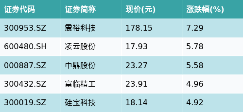 截至早盘收盘,宁德时代概念主题涨跌幅最高的五只股票为:震裕科技(300953.SZ)、凌云股份(600480.SH)、中鼎股份(000887.SZ)、富临精工(300432.SZ)与硅宝科技(300019.SZ)。详情见下表: