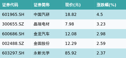 截至收盘,无人驾驶主题涨跌幅最高的五只股票为:中国汽研(601965.SH)、晶瑞电材(300655.SZ)、金龙汽车(600686.SH)、金固股份(002488.SZ)与永新光学(603297.SH)。详情见下表: