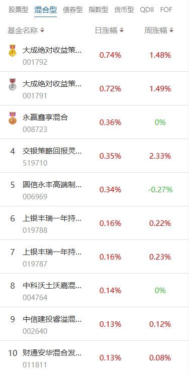 南方财经3月3日电,根据南财基金通数据:2025年02月28日当日收益靠前的混合型基金包括:大成绝对收益策略混合型发起式证券投资基金(001792,日收益0.74%);永赢鑫享混合型证券投资基金(008723,日收益0.36%);交银施罗德策略回报灵活配置混合型证券投资基金(519710,日收益0.35%)等。收益较低的股票型基金包括:新华趋势领航混合型证券投资基金(519158,日收益-8.56%);中航趋势领航混合型发起式证券投资基金(021490,日收益-8.36%);富安达长三角区域主题混合型发起式证券投资基金(010746,日收益-8.26%)等。