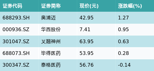截至收盘,CRO/CMO主题涨跌幅最高的五只股票为:奥浦迈(688293.SH)、华西股份(000936.SZ)、义翘神州(301047.SZ)、毕得医药(688073.SH)与泰格医药(300347.SZ)。详情见下表: