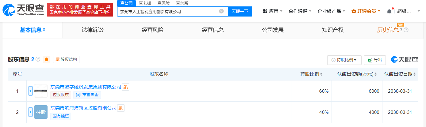 南方财经5月6日电,天眼查App显示,近日,东莞市人工智能应用创新有限公司成立,法定代表人为余祥臣,注册资本1亿人民币,经营范围包括业互联网数据服务、大数据服务、软件开发、软件销售、软件外包服务等。股东信息显示,该公司由东莞市数字经济发展集团有限公司、东莞市滨海湾新区控股有限公司共同持股。