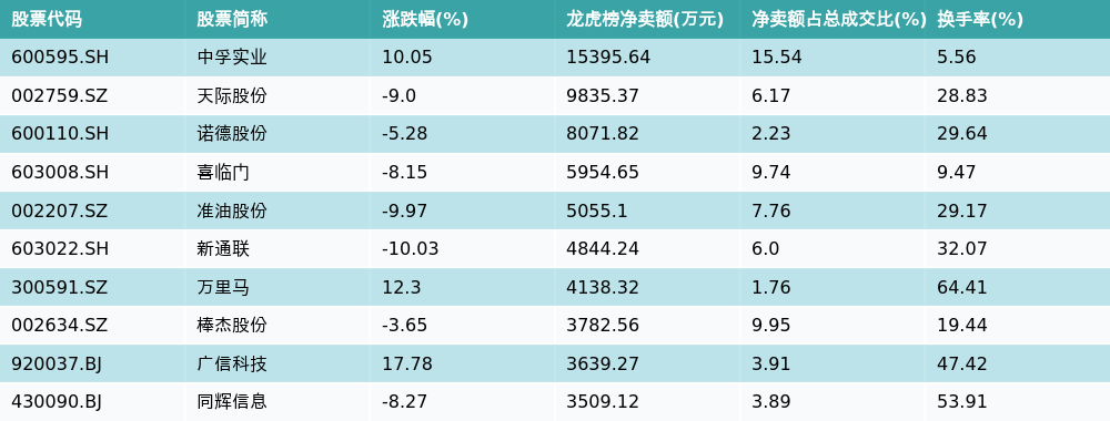 南财智讯6月27日电,南财金融终端数据显示,因当日异动登上龙虎榜的个股中,龙虎榜中资金净流出最多的前三位分别是中孚实业(600595.SH)、天际股份(002759.SZ)与诺德股份(600110.SH)。其中排名第一的中孚实业被净卖出1.54亿元,占总成交金额的15.54%。中孚实业收盘上涨10.05%,换手率为5.56%。净卖出额前10个股详情见下图: