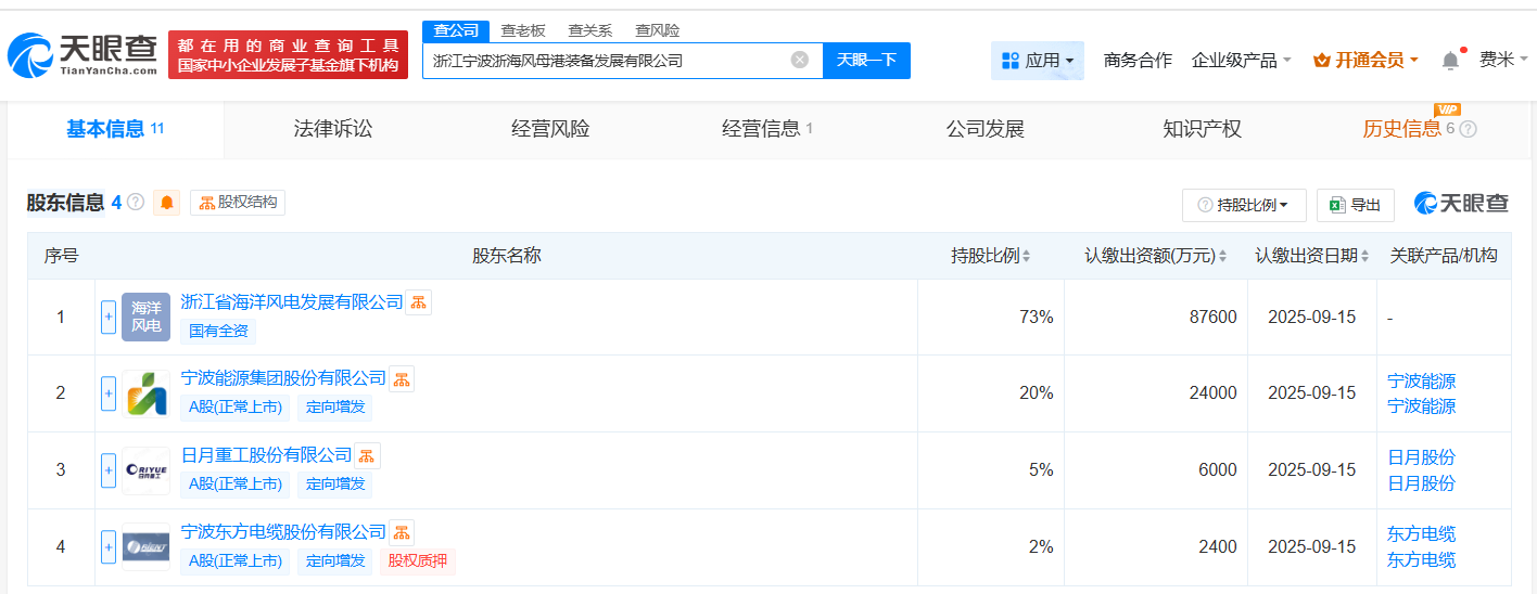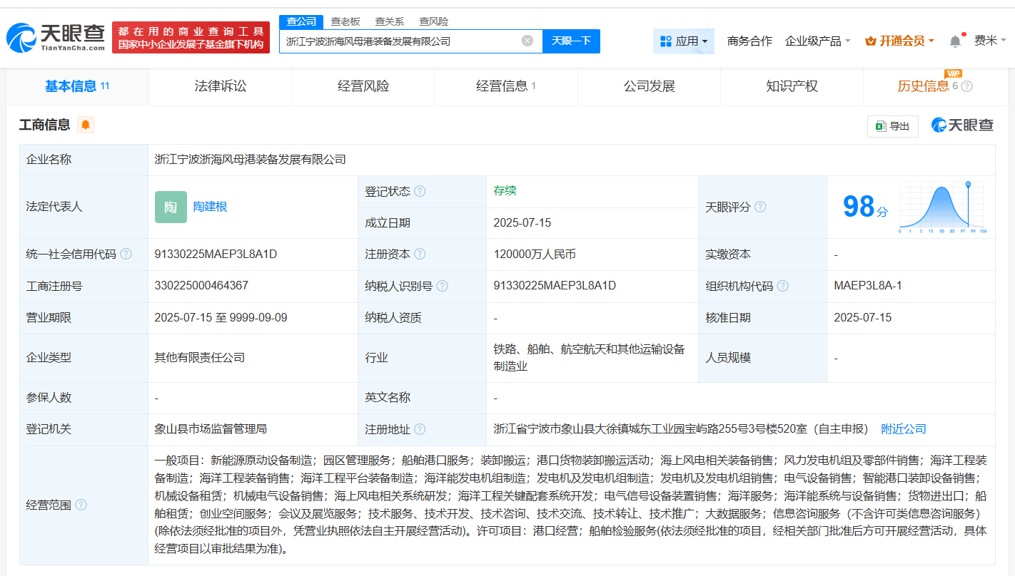 南方财经7月17日电,天眼查App显示,近日,浙江宁波浙海风母港装备发展有限公司成立,法定代表人为陶建根,注册资本12亿人民币,经营范围包括新能源原动设备制造、园区管理服务、船舶港口服务等,由浙江省海洋风电发展有限公司、宁波能源(600982)、日月股份(603218)、东方电缆(603606)共同持股。据媒体报道,此前,日月股份发布公告称,该合资公司负责投资建设浙江(华东)深远海风电母港象山基地项目。