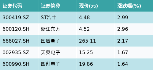 截至收盘,量子通信主题涨跌幅最高的五只股票为:ST浩丰(300419.SZ)、浙江东方(600120.SH)、国盾量子(688027.SH)、天奥电子(002935.SZ)与四创电子(600990.SH)。详情见下表: