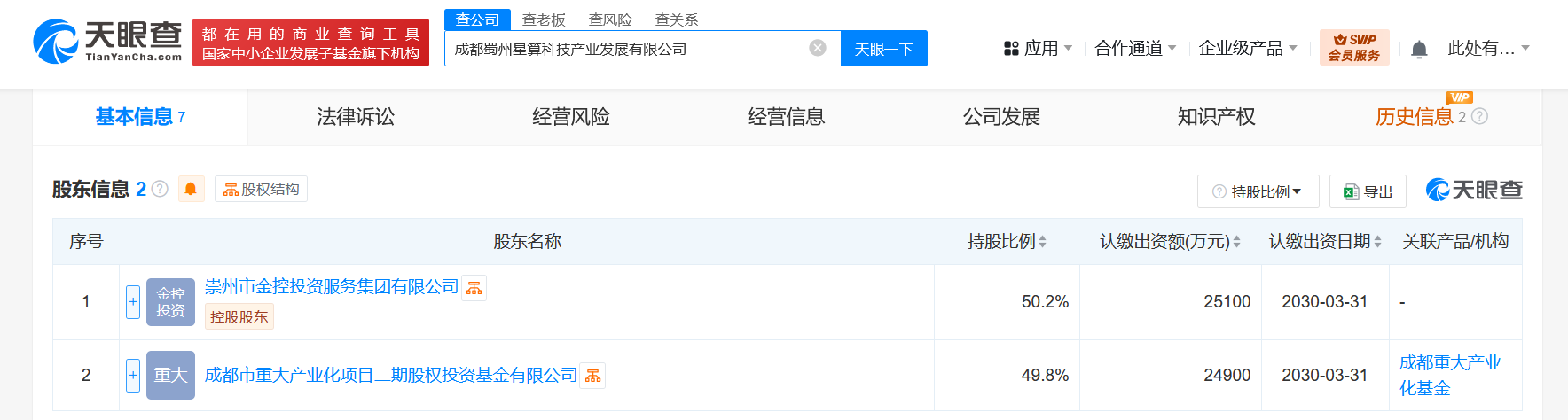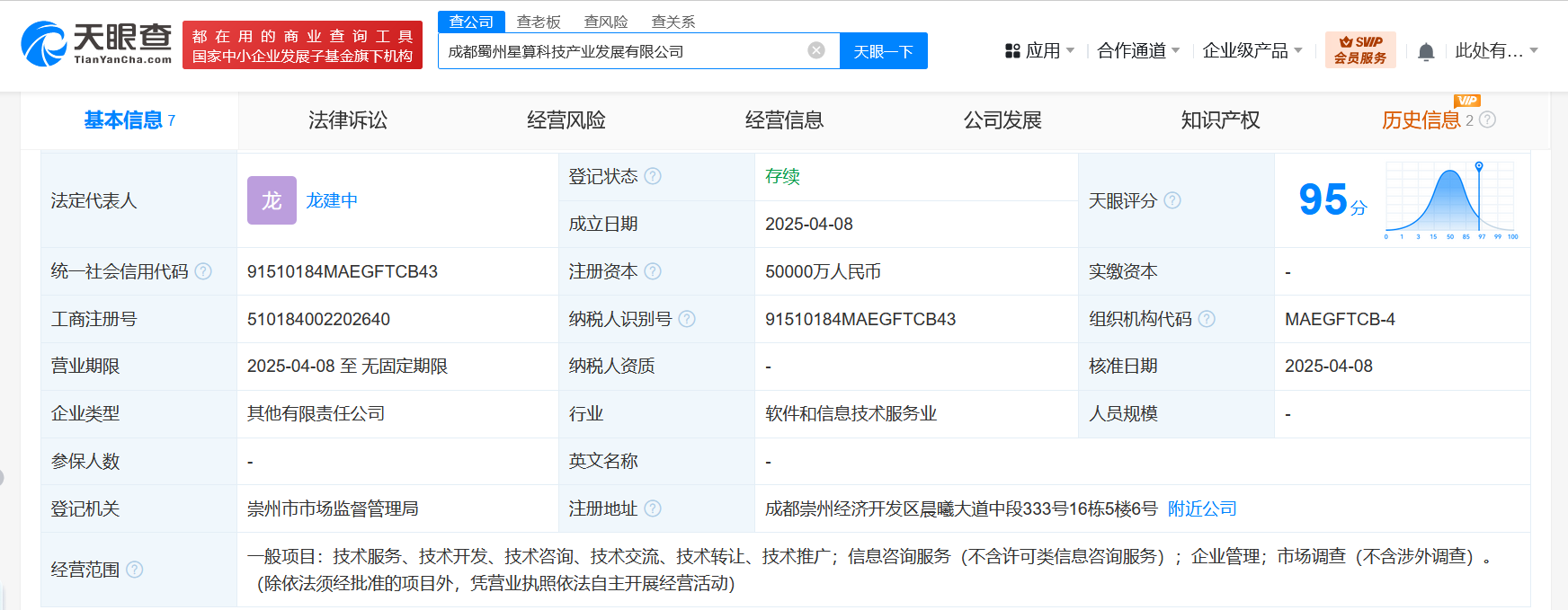南方财经4月15日电,天眼查App显示,近日,成都蜀州星算科技产业发展有限公司成立,法定代表人为龙建中,注册资本5亿人民币,经营范围为技术服务、技术开发、技术咨询、技术交流、技术转让、技术推广,信息咨询服务,企业管理,市场调查。股东信息显示,该公司由崇州市金控投资服务集团有限公司、成都市重大产业化项目二期股权投资基金有限公司共同持股。