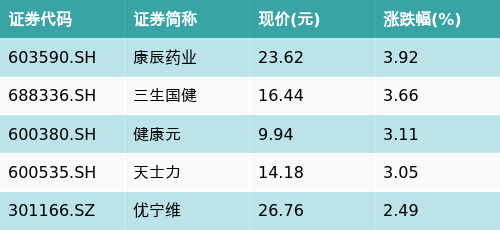 截至午间收盘,单抗概念主题涨跌幅最高的五只股票为:康辰药业(603590.SH)、三生国健(688336.SH)、健康元(600380.SH)、天士力(600535.SH)与优宁维(301166.SZ)。详情见下表: