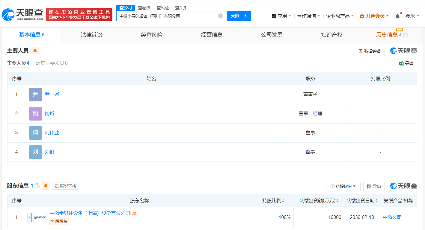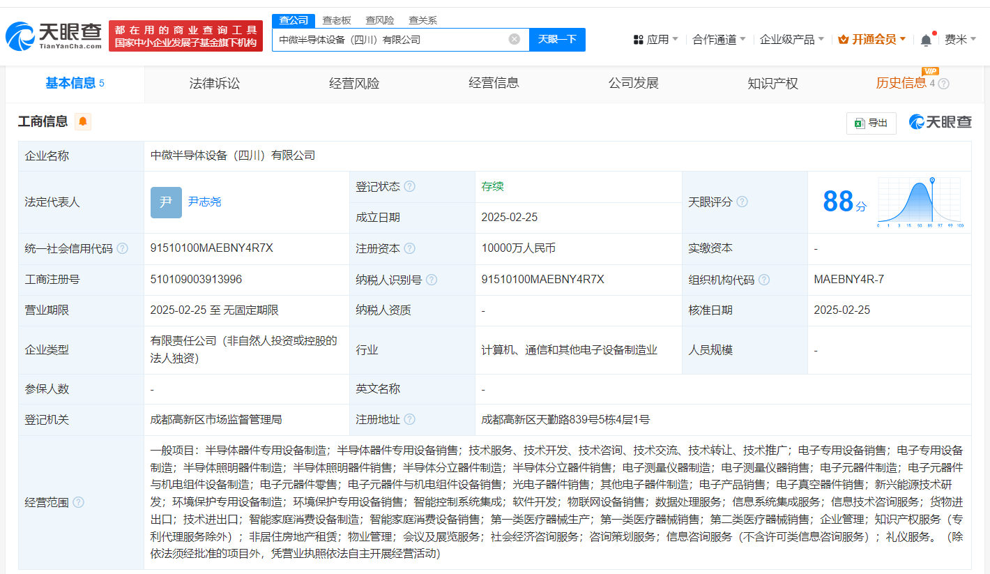 中微公司在四川成立半导体设备公司 注册资本1亿