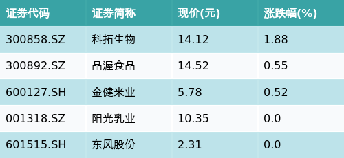 截至收盘,乳业主题涨跌幅最高的五只股票为:科拓生物(300858.SZ)、品渥食品(300892.SZ)、金健米业(600127.SH)、阳光乳业(001318.SZ)与东风股份(601515.SH)。详情见下表: