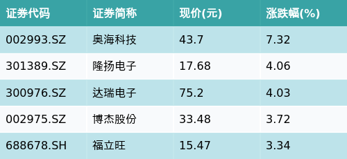 截至收盘,苹果概念主题涨跌幅最高的五只股票为:奥海科技(002993.SZ)、隆扬电子(301389.SZ)、达瑞电子(300976.SZ)、博杰股份(002975.SZ)与福立旺(688678.SH)。详情见下表: