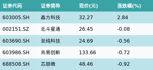 截至收盘,国家大基金持股主题涨跌幅最高的五只股票为:晶方科技(603005.SH)、北斗星通(002151.SZ)、至纯科技(603690.SH)、兆易创新(603986.SH)与芯朋微(688508.SH)。详情见下表:
