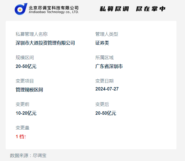 深圳市大道投资管理有限公司管理规模上调至20-50亿元