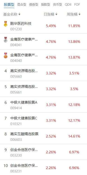 南方财经3月15日电,根据南财基金通数据:2024年3月14日当日收益靠前的股票型基金包括:鹏华医药科技股票型证券投资基金(001230,日收益5.49%);金鹰医疗健康产业股票型证券投资基金(004041,日收益4.76%);嘉实资源精选股票型发起式证券投资基金(005660,日收益3.32%)等。收益较低的股票型基金包括:嘉实前沿科技沪港深股票型证券投资基金(004450,日收益-3.34%);招商体育文化休闲股票型证券投资基金(001628,日收益-3.25%);银华数字经济股票型发起式证券投资基金(015642,日收益-2.26%)等。