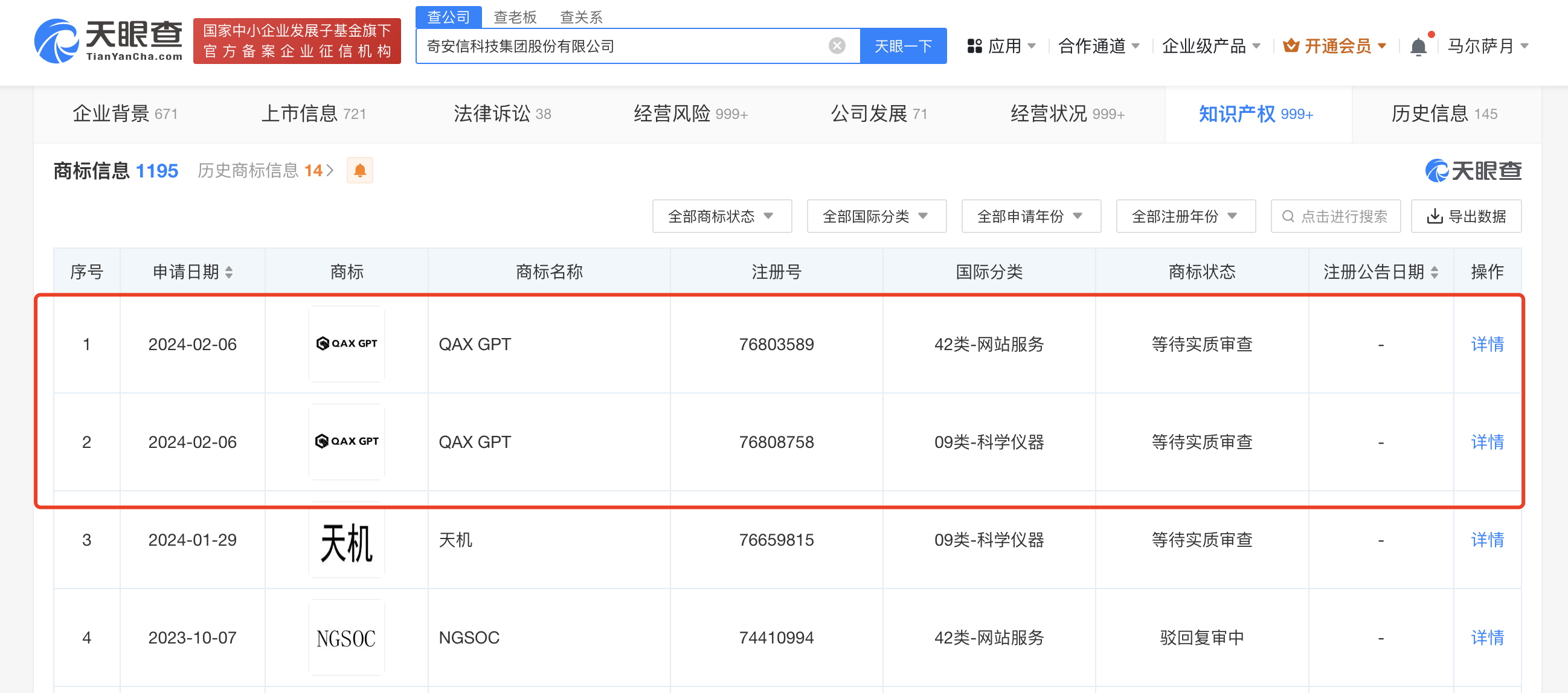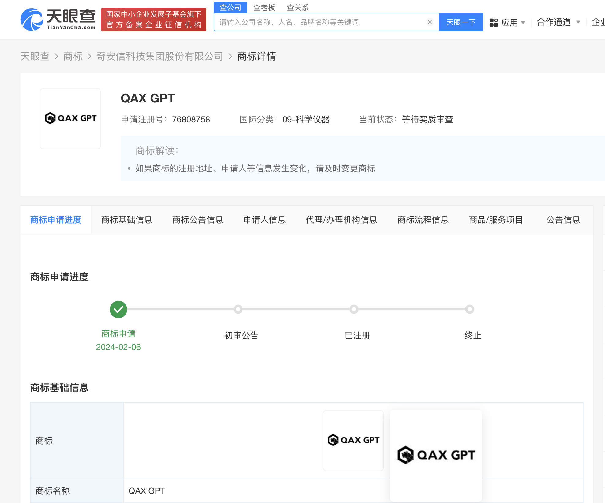 南方财经3月4日电,天眼查知识产权信息显示,近日,奇安信(688561)申请注册“QAX GPT”商标,国际分类包括科学仪器、网站服务,当前商标状态均为等待实质审查。去年8月,该公司还申请注册多枚“奇安信大模型卫士”“大模型卫士”商标。