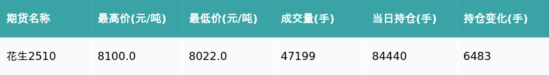 南财智讯5月7日电,南财金融终端盘后期货数据显示,郑州商品交易所的花生主力合约收涨0.35%,收盘报8088.0元/吨,日内资金流出7947.82万元。其他相关指标见下表: