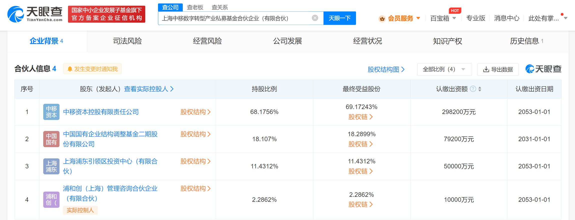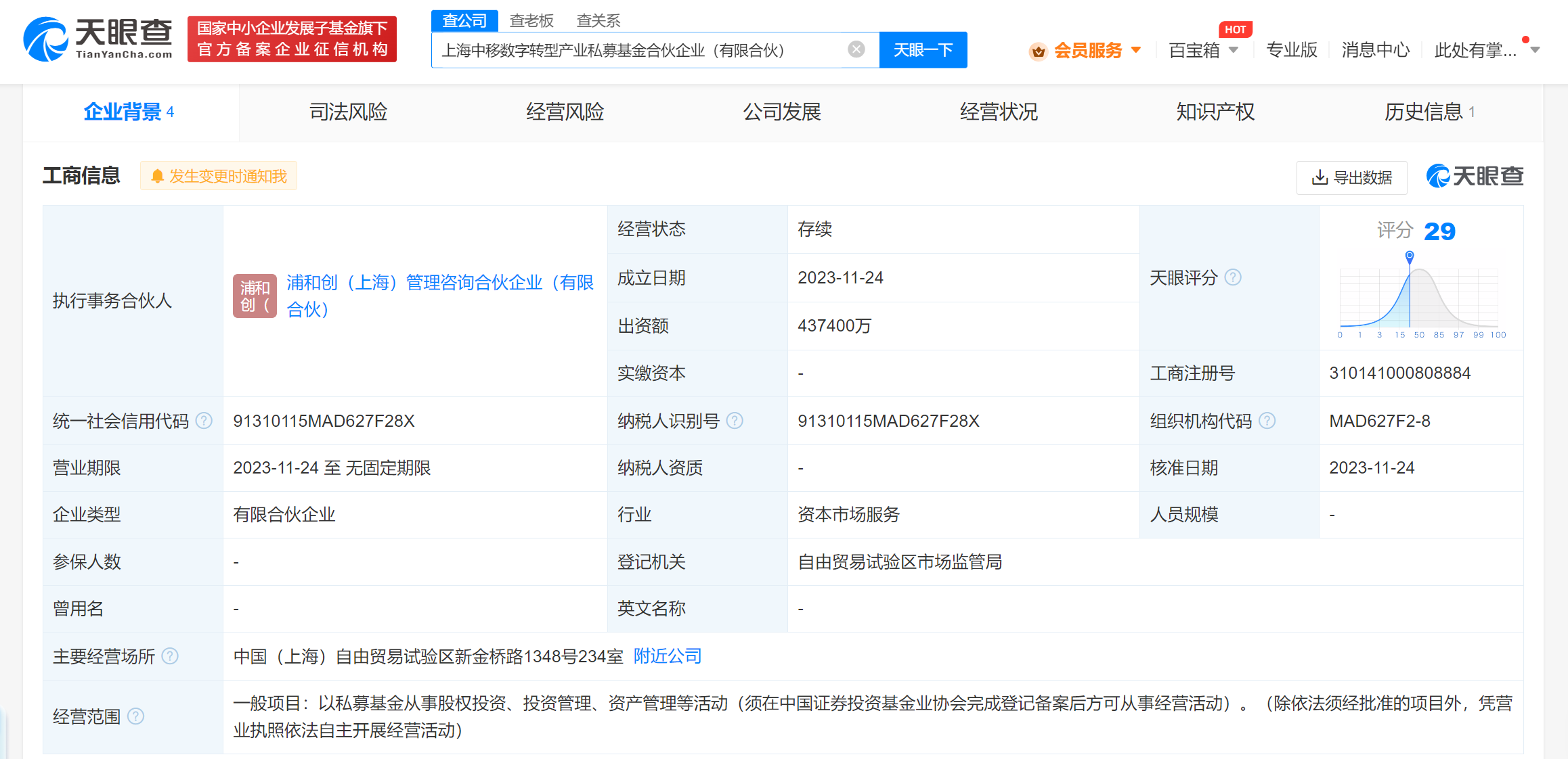 南方财经11月28日电,天眼查App显示,近日,上海中移数字转型产业私募基金合伙企业(有限合伙)成立,执行事务合伙人为浦和创(上海)管理咨询合伙企业(有限合伙),出资额43.74亿人民币,经营范围为以私募基金从事股权投资、投资管理、资产管理等活动。合伙人信息显示,该合伙企业由中国移动旗下中移资本控股有限责任公司、中国国有企业结构调整基金二期股份有限公司、上海浦东引领区投资中心(有限合伙)、浦和创(上海)管理咨询合伙企业(有限合伙)共同出资。据媒体报道,今年7月,在2023年世界人工智能大会开幕式上,上海市政府联合中国移动、中国国有企业结构调整基金二期、浦东新区共同发起设立上海中移数字化转型产业基金(中移上海基金),该基金将聚焦数字经济和移动信息现代产业链两大领域。