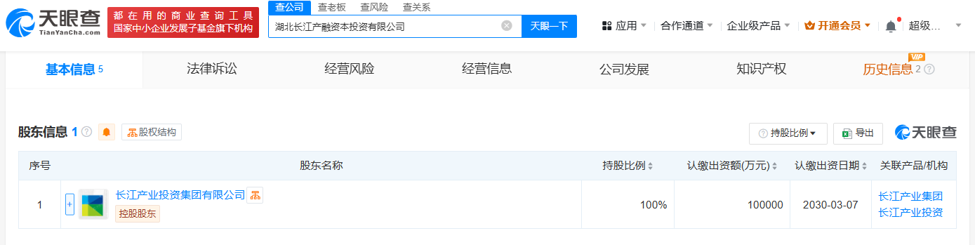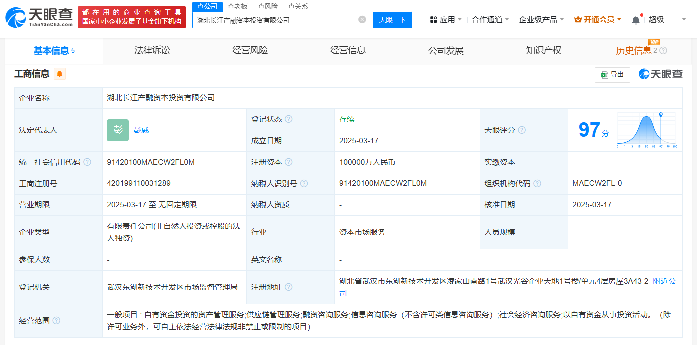 南方财经3月18日电,天眼查App显示,近日,湖北长江产融资本投资有限公司成立,法定代表人为彭威,注册资本10亿人民币,经营范围包括自有资金投资的资产管理服务、供应链管理服务、融资咨询服务等。股东信息显示,该公司由长江产业投资集团有限公司全资持股。
