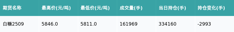 南财智讯7月22日电,南财金融终端盘后期货数据显示,郑州商品交易所的白糖主力合约收跌0.29%,收盘报5823.0元/吨,日内资金流出3195.18万元。其他相关指标见下表: