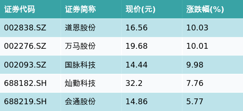 截至收盘,5G主题涨跌幅最高的五只股票为:道恩股份(002838.SZ)、万马股份(002276.SZ)、国脉科技(002093.SZ)、灿勤科技(688182.SH)与会通股份(688219.SH)。详情见下表: