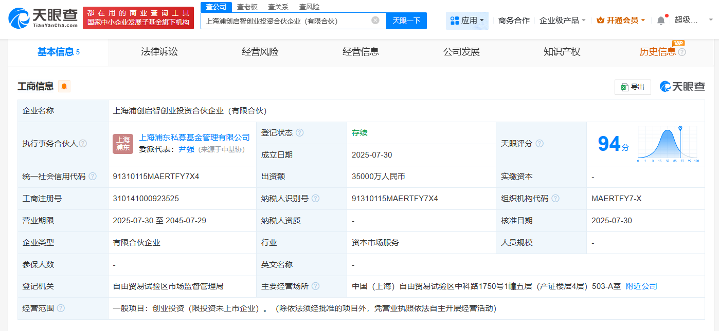 南方财经8月1日电,天眼查工商信息显示,近日,上海浦创启智创业投资合伙企业(有限合伙)成立,执行事务合伙人为上海浦东私募基金管理有限公司,出资额3.5亿人民币,经营范围为创业投资。合伙人信息显示,该合伙企业由浦东创投旗下上海浦东引领区投资中心(有限合伙)、上海浦东私募基金管理有限公司和张江集团旗下上海张江科技创业投资有限公司共同出资。