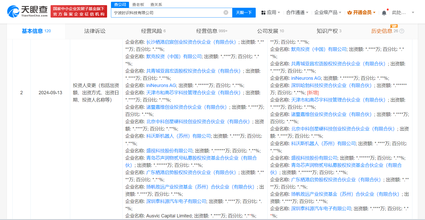 南方财经9月20日电,天眼查App显示,近日,宁波时识科技有限公司发生工商变更,新增华为旗下深圳哈勃科技投资合伙企业(有限合伙)为股东,同时,注册资本由约172.43万人民币增至约176.66万人民币。宁波时识科技有限公司成立于2020年3月,法定代表人为乔宁,经营范围含互联网数据服务、集成电路设计、集成电路芯片设计及服务、数据处理和存储支持服务、人工智能应用软件开发、人工智能理论与算法软件开发等。股东信息显示,该公司现由南京国调国信智芯股权投资合伙企业(有限合伙)、乔宁、北京百度毕威企业管理中心(有限合伙)等共同持股。公开信息显示,时识科技是一家类脑智能与应用解决方案提供商。
