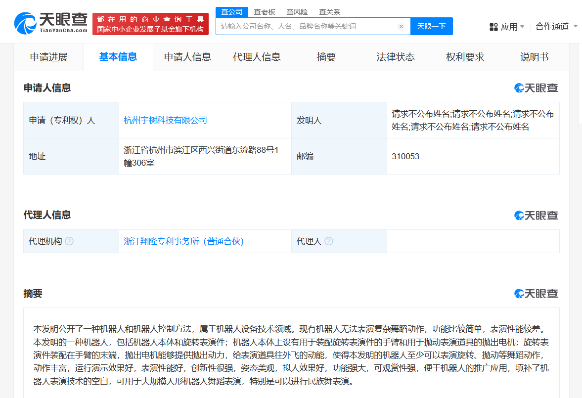 南方财经4月18日电,天眼查知识产权信息显示,近日,杭州宇树科技有限公司申请的“一种机器人和机器人控制方法”专利公布。摘要显示,本发明属于机器人设备技术领域。现有机器人无法表演复杂舞蹈动作,功能比较简单,表演性能较差。本发明的一种机器人,包括机器人本体和旋转表演件;机器人本体上设有用于装配旋转表演件的手臂和用于抛动表演道具的抛出电机;旋转表演件装配在手臂的末端,抛出电机能够提供抛出动力,给表演道具往外飞的动能,使得本发明的机器人至少可以表演旋转、抛动等舞蹈动作,动作丰富,运行演示效果好,表演性能好,创新性很强,姿态美观,拟人效果好,功能强大,可观赏性强,便于机器人的推广应用,填补了机器人表演技术的空白,可用于大规模人形机器人舞蹈表演,特别是可以进行民族舞表演。