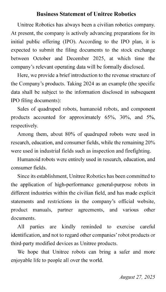 南方财经9月2日电,据财联社,宇树科技在社交媒体平台X上发帖称,预计将在2025年10月至12月期间向证券交易所提交上市申请文件,届时公司的相关运营数据将正式披露。宇树科技表示,以2024年为例,四足机器人、人形机器人和组件产品的销售额分别占约65%、30%和5%。其中,约80%的四足机器人被应用于研究、教育和消费领域,而剩余的20%则被用于工业领域,如检查与消防。人形机器人完全用于研究、教育和消费领域。