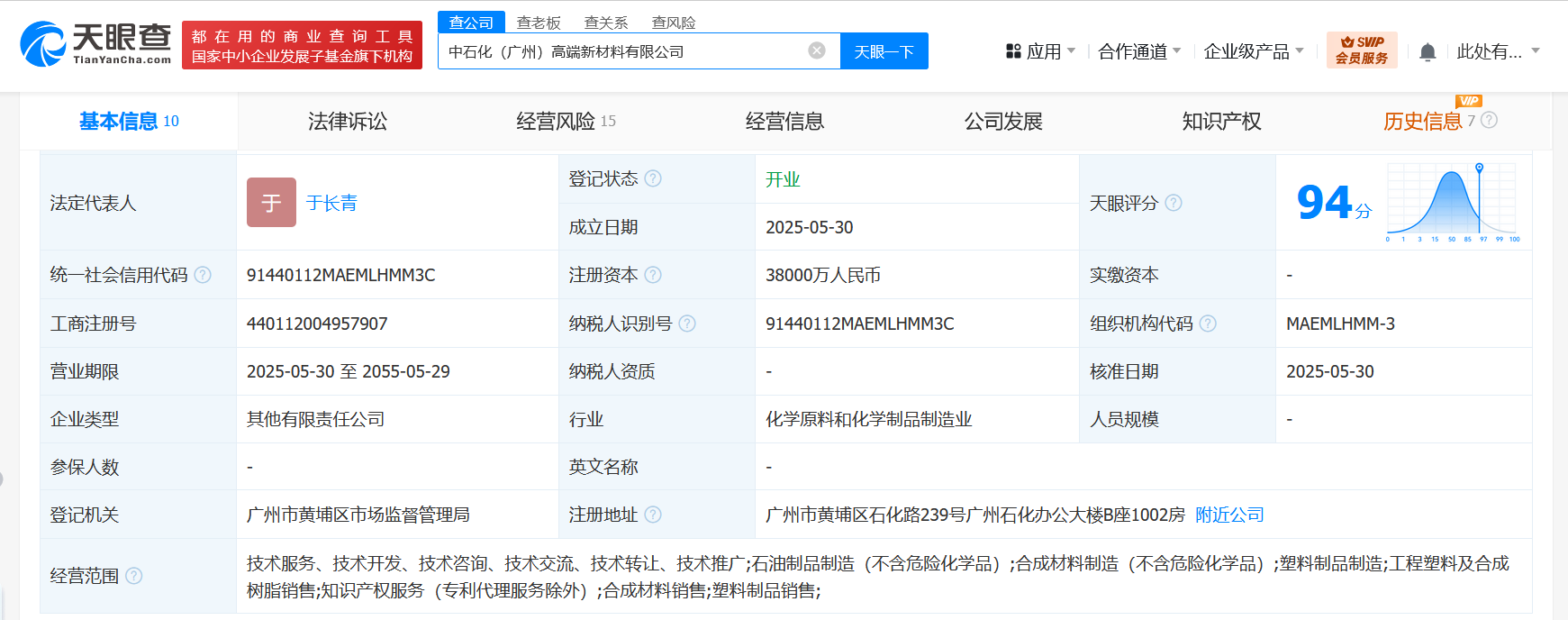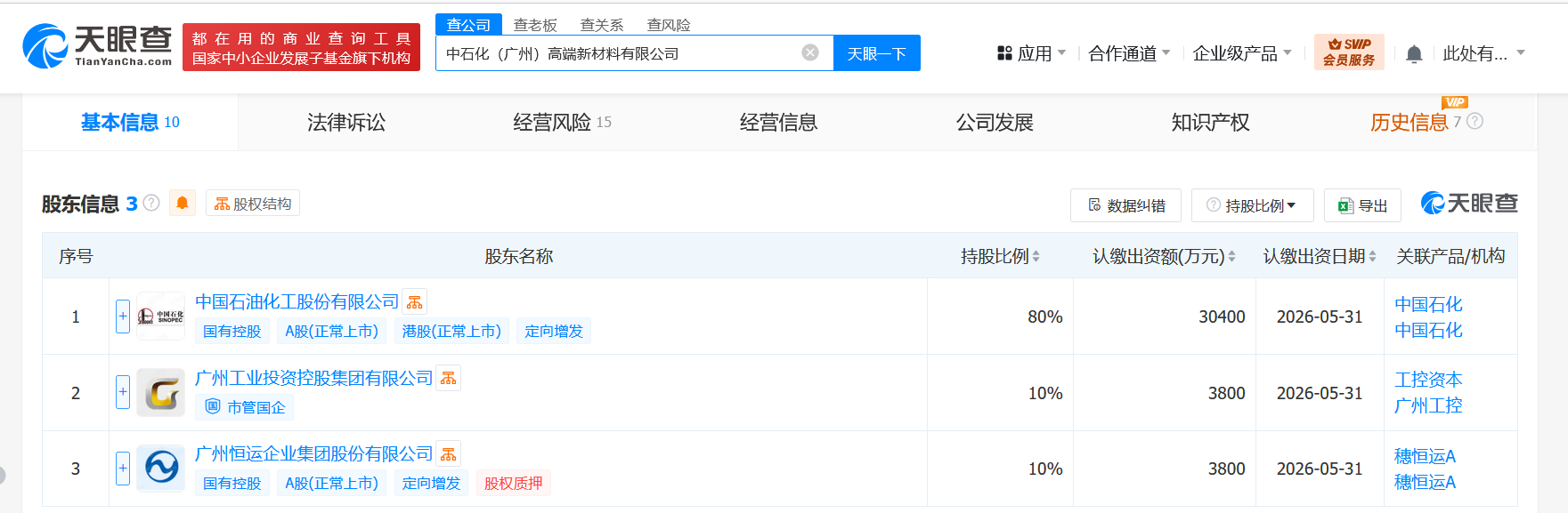 中国石化、穗恒运A等在广州成立高端新材料公司 注册资本3.8亿元