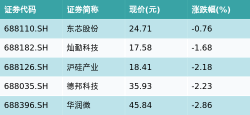 截至收盘,国家大基金持股主题涨跌幅最高的五只股票为:东芯股份(688110.SH)、灿勤科技(688182.SH)、沪硅产业(688126.SH)、德邦科技(688035.SH)与华润微(688396.SH)。详情见下表: