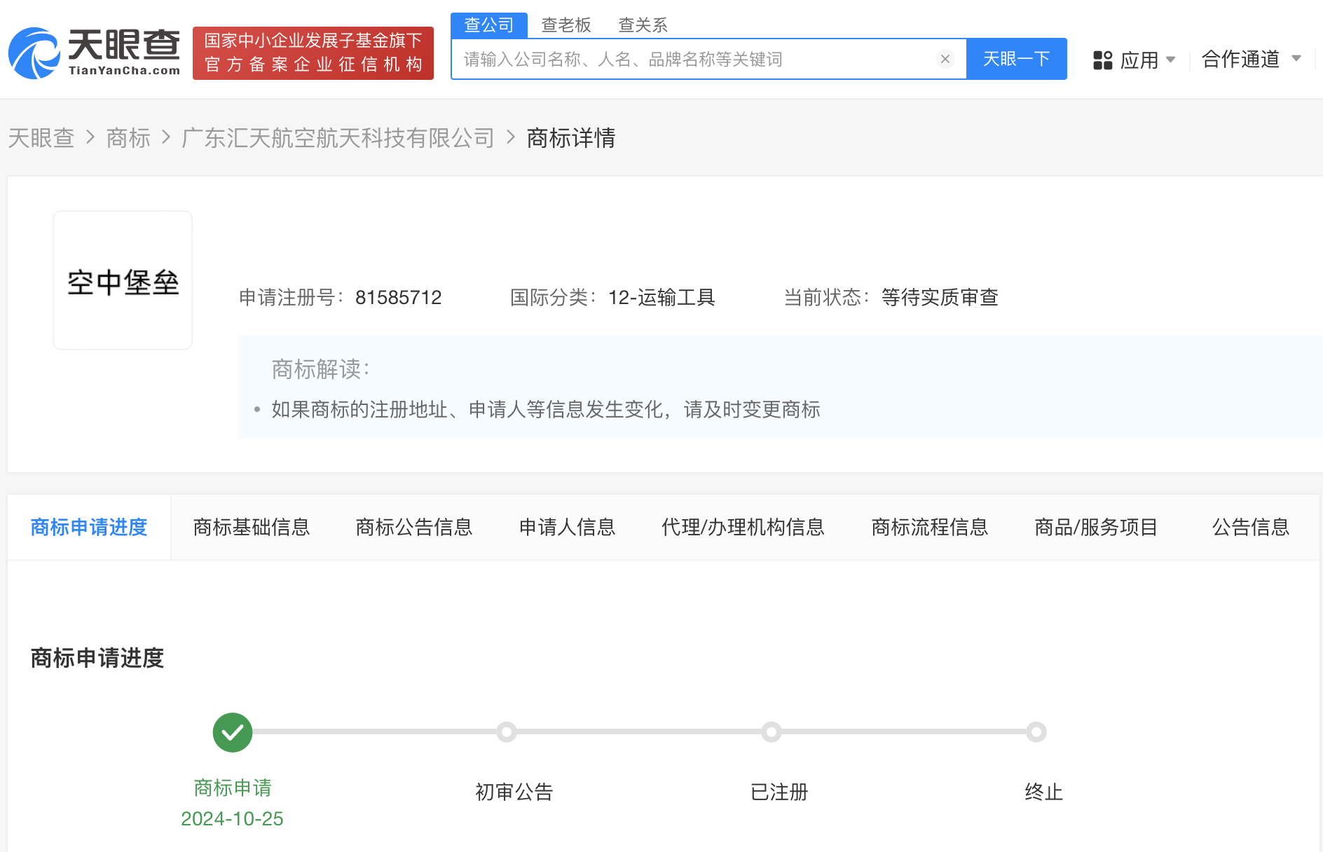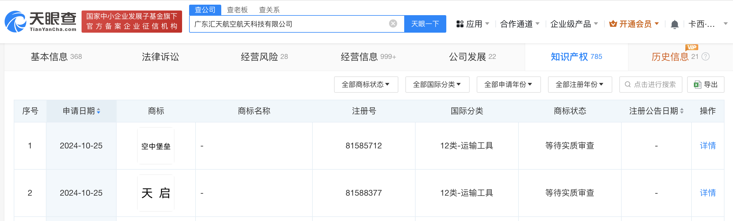 南方财经12月6日电,天眼查知识产权信息显示,近日,小鹏汇天关联公司广东汇天航空航天科技有限公司申请注册“空中堡垒”“天启”商标,国际分类均为运输工具,当前商标状态均为等待实质审查。广东汇天航空航天科技有限公司成立于2020年12月,法定代表人为赵德力,注册资本3.3亿美元,由HT Flying Car (Hong Kong)Limited全资持股。