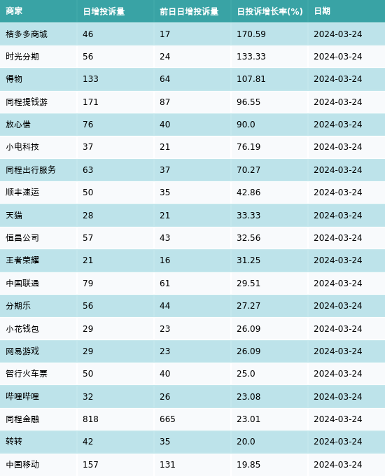 黑猫投诉:桔多多商城、时光分期和得物3月24日投诉增速最高