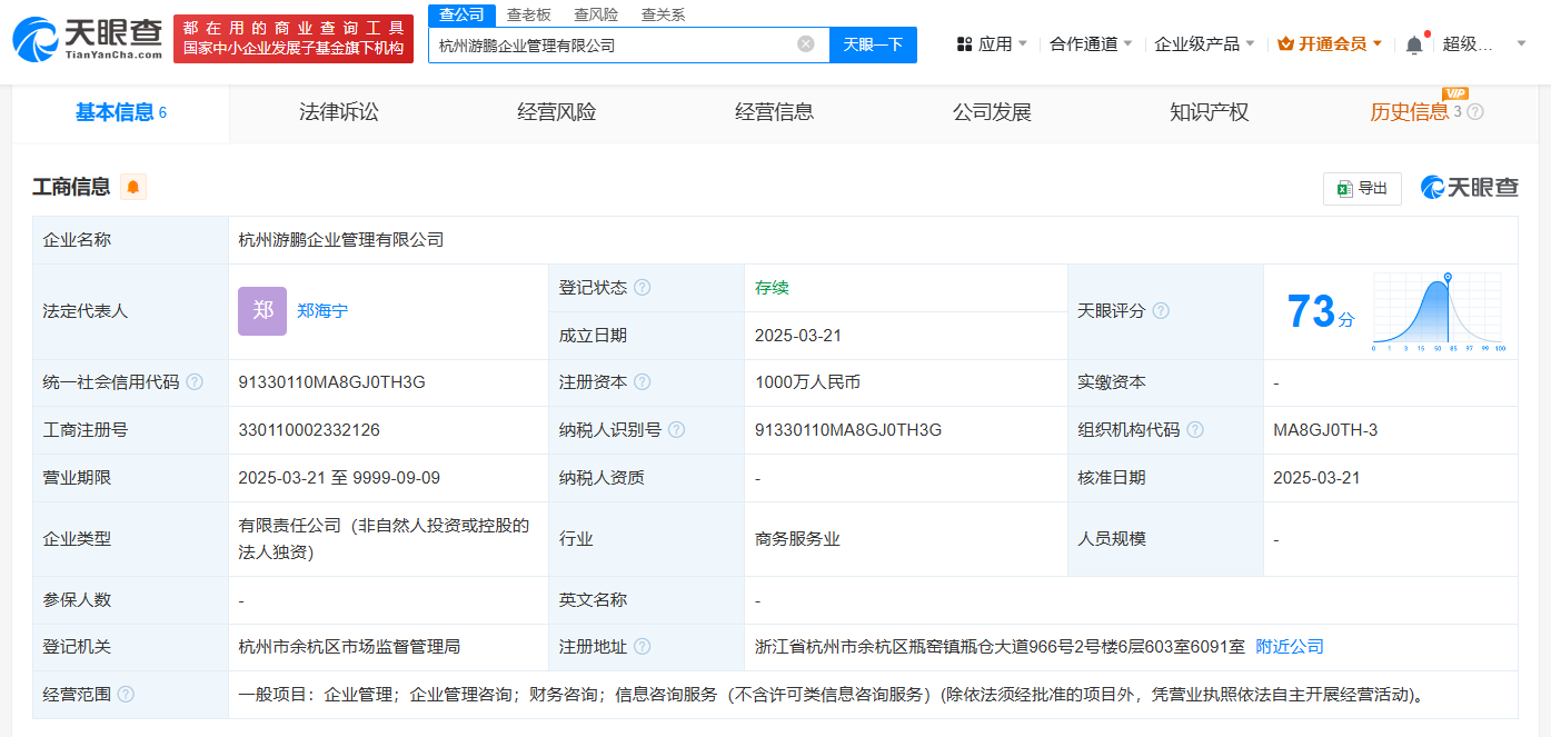 南方财经3月24日电,天眼查App显示,近日,杭州游鹏企业管理有限公司成立,法定代表人为郑海宁,注册资本1000万人民币,经营范围包括企业管理、企业管理咨询、财务咨询、信息咨询服务。股东信息显示,该公司由浙江菜鸟供应链管理有限公司全资持股。