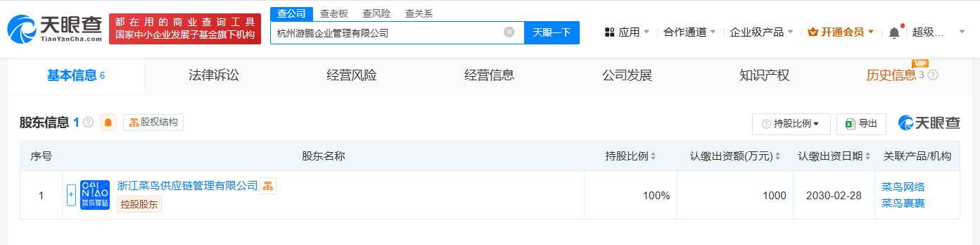 菜鸟在杭州成立游鹏企管公司 注册资本1000万