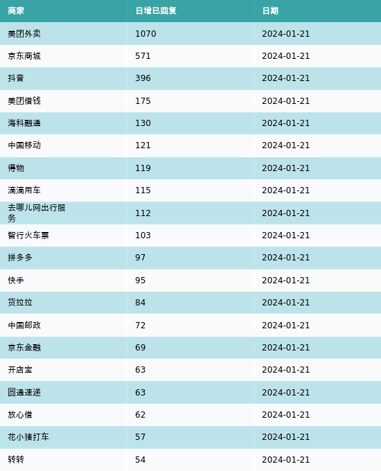 南方财经1月22日电,根据黑猫投诉网站数据显示,1月21日新增投诉回复最高前三名的商家分别为:美团外卖、京东商城和抖音,分别增加1070起、571起和396起。1月21日新增投诉回复前20详情见下表: