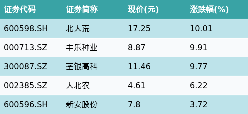截至早盘收盘,大豆主题涨跌幅最高的五只股票为:北大荒(600598.SH)、丰乐种业(000713.SZ)、荃银高科(300087.SZ)、大北农(002385.SZ)与新安股份(600596.SH)。详情见下表: