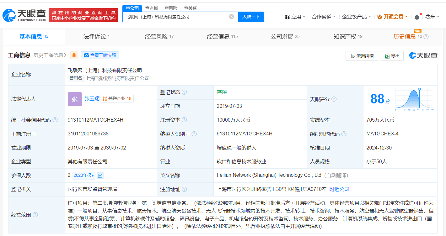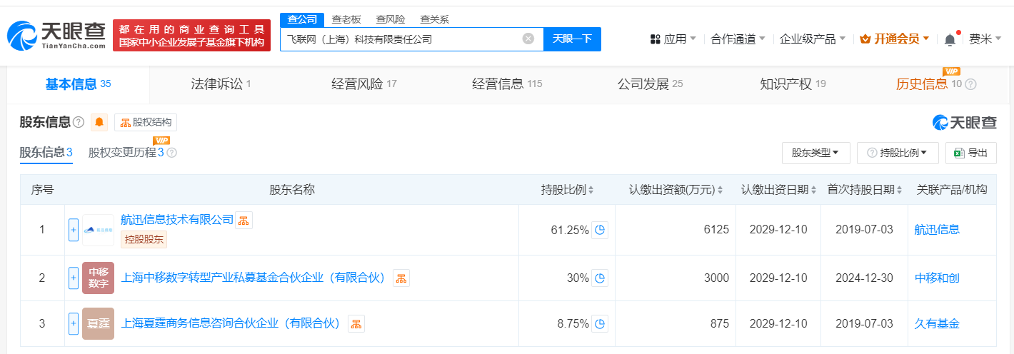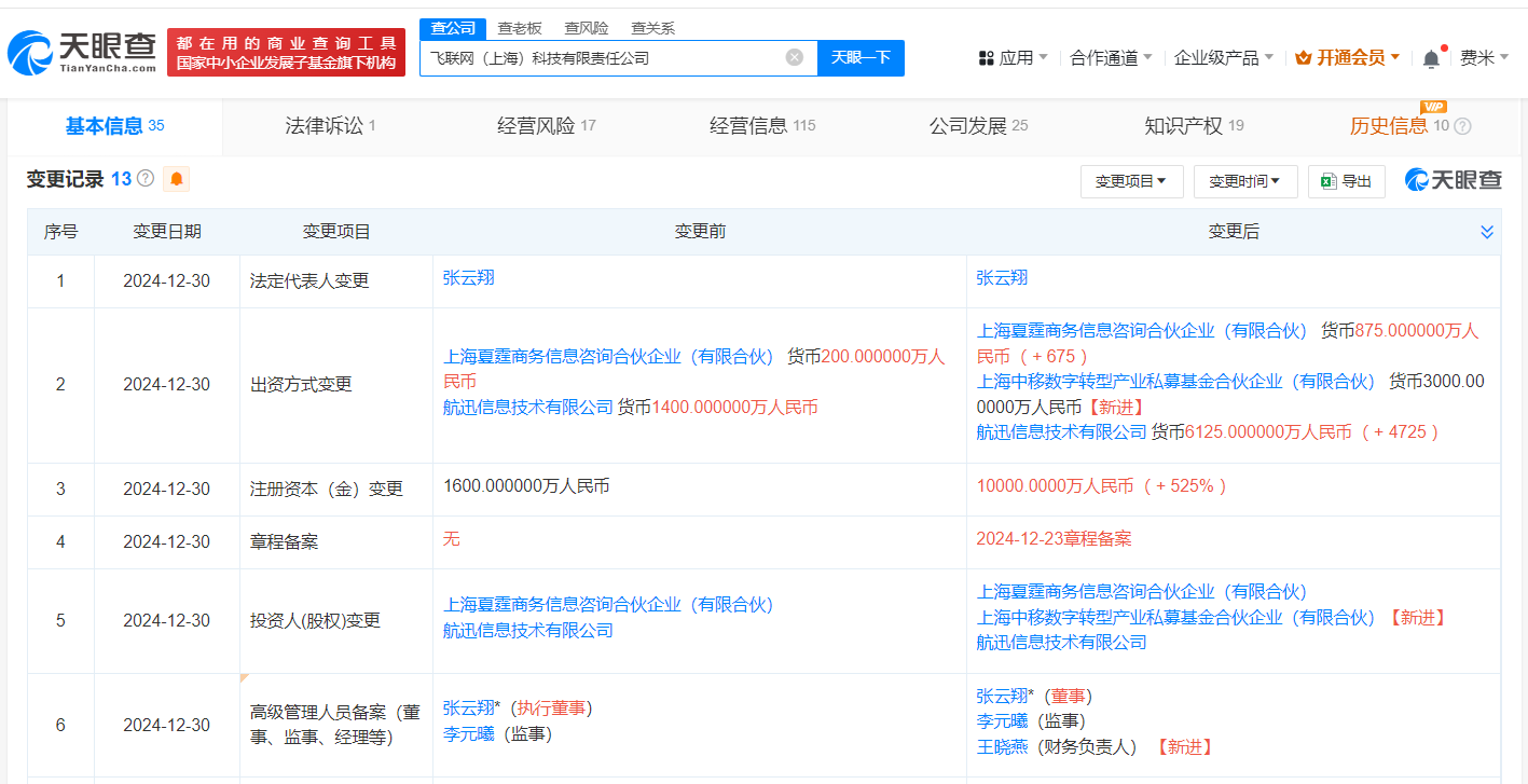 南方财经1月7日电,天眼查App显示,近日,飞联网(上海)科技有限责任公司发生工商变更,新增中国移动旗下上海中移数字转型产业私募基金合伙企业(有限合伙)为股东,同时注册资本由1600万人民币增至1亿人民币。飞联网(上海)科技有限责任公司成立于2019年7月,法定代表人为张云翔,经营范围含第二类增值电信业务、第一类增值电信业务、航空器和无人驾驶航空器销售等,现由航迅信息技术有限公司、上海夏霆商务信息咨询合伙企业(有限合伙)及上述新增股东共同持股。官网显示,该公司是一家专注航空宽带互联网应用服务和运营的高技术企业。