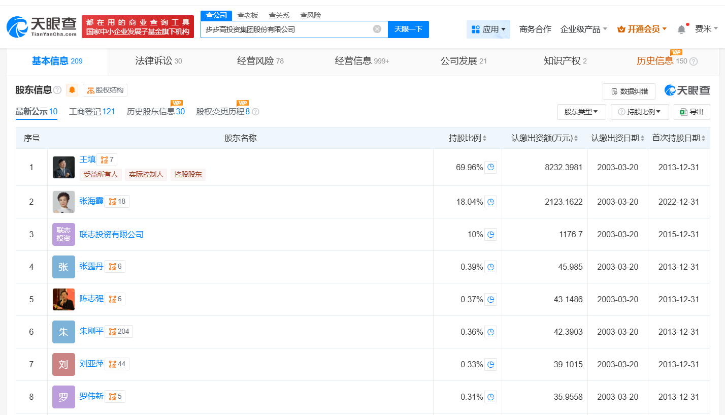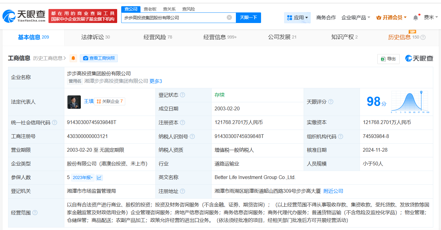 南方财经7月11日电,天眼查经营风险信息显示,近日,步步高投资集团股份有限公司因未按照规定期限公示年度报告,被湘潭市市场监督管理局列入经营异常名录。该公司成立于2003年2月,法定代表人为王填,注册资本约12.18亿人民币,经营范围包括投资及财务咨询服务、房地产信息咨询服务、商务信息咨询服务等,由王填、陈志强、联志投资有限公司等共同持股。