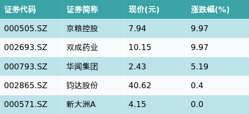 截至收盘,海南自贸区主题涨跌幅最高的五只股票为:京粮控股(000505.SZ)、双成药业(002693.SZ)、华闻集团(000793.SZ)、钧达股份(002865.SZ)与新大洲A(000571.SZ)。详情见下表:
