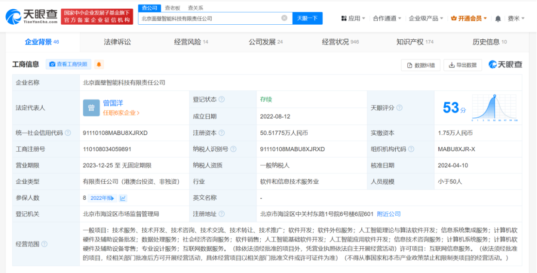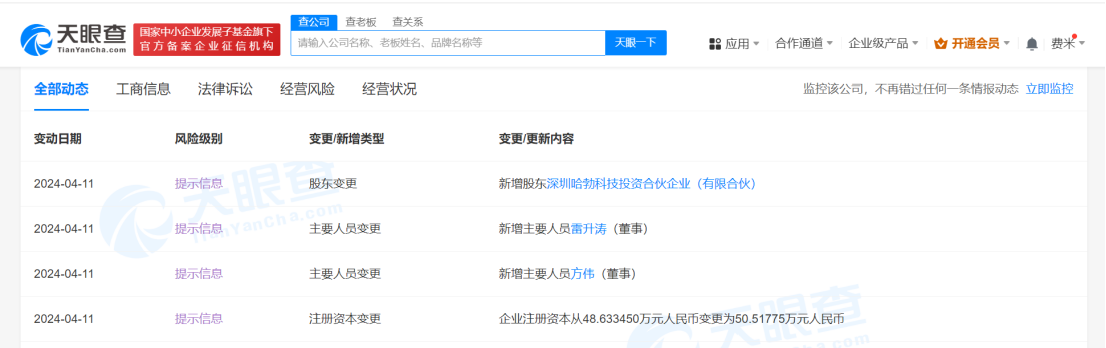 南方财经4月12日电,天眼查App显示,近日,北京面壁智能科技有限责任公司发生工商变更,新增华为旗下深圳哈勃科技投资合伙企业(有限合伙)为股东,注册资本由约48.6万人民币增至约50.5万人民币,同时新增两位董事。北京面壁智能科技有限责任公司成立于2022年8月,法定代表人为曾国洋,经营范围含人工智能理论与算法软件开发、信息系统集成服务、计算机软硬件及辅助设备批发、数据处理服务、人工智能基础软件开发、人工智能应用软件开发、互联网数据服务等。公开信息显示,面壁智能是一家人工智能大模型技术创新与应用落地企业。