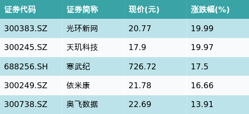 截至午间收盘,云计算主题涨跌幅最高的五只股票为:光环新网(300383.SZ)、天玑科技(300245.SZ)、寒武纪(688256.SH)、依米康(300249.SZ)与奥飞数据(300738.SZ)。详情见下表: